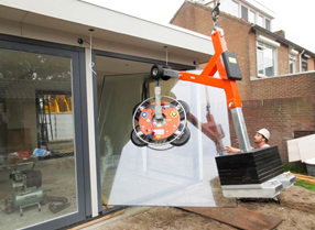 Часто, когда необходимо устанавливать стеклянные панели под балконами или монтировать оконную разделку на внутреннюю часть рамы окна, вакуум-ным подъемником, свисающим с крана, невозможно воспользоваться, т.к. поднимаемый вес смещается от подъемного крюка.