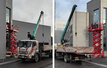 Ножничный подъёмник AS1012, вакуумный захват Arlifter GS-500 и кран-манипулятор помогли заменить испорченные противопожарные стекла с гелевым заполнением.