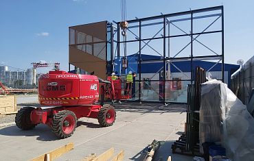Вакуумный захват GS-500 и коленчатый подъемник LGMG AR16J помогли при монтаже макета для «РМК-Арены» на Урале.