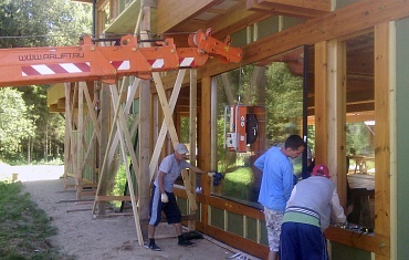 Неизменный тандем мини-крана Jekko SPX 527CDH и вакуумного захвата ARLIFTER GS-750 работал в городе Котельники Московской области на остеклении коттеджа
