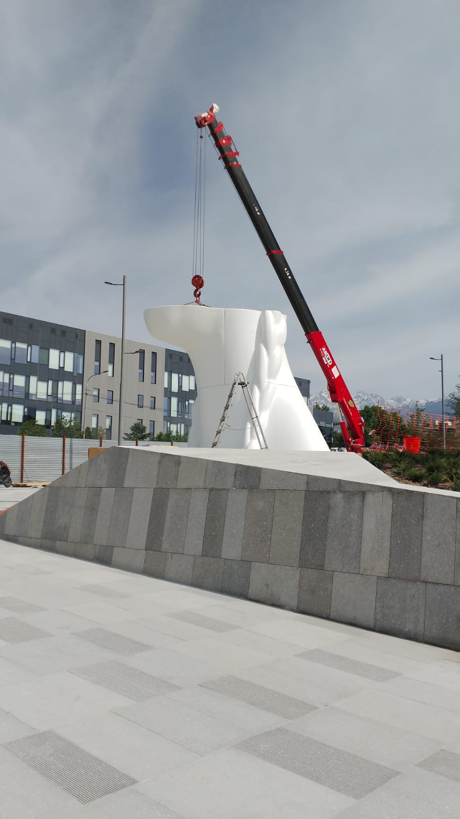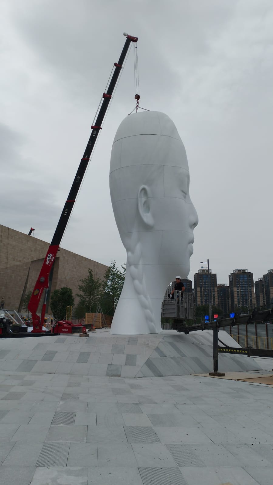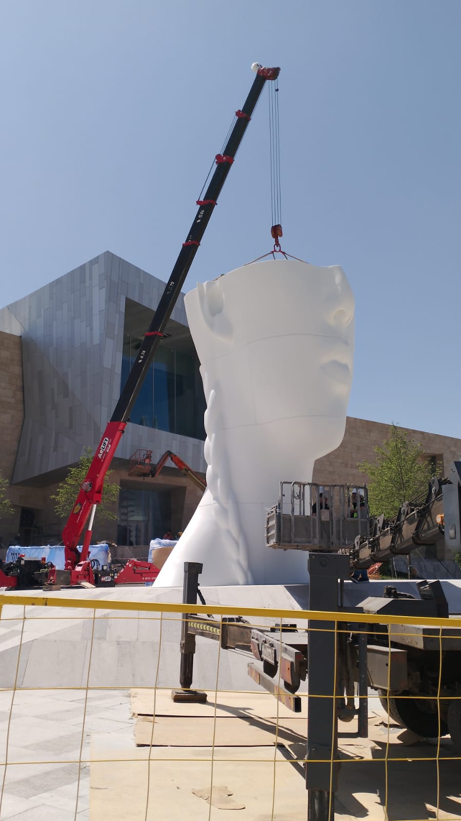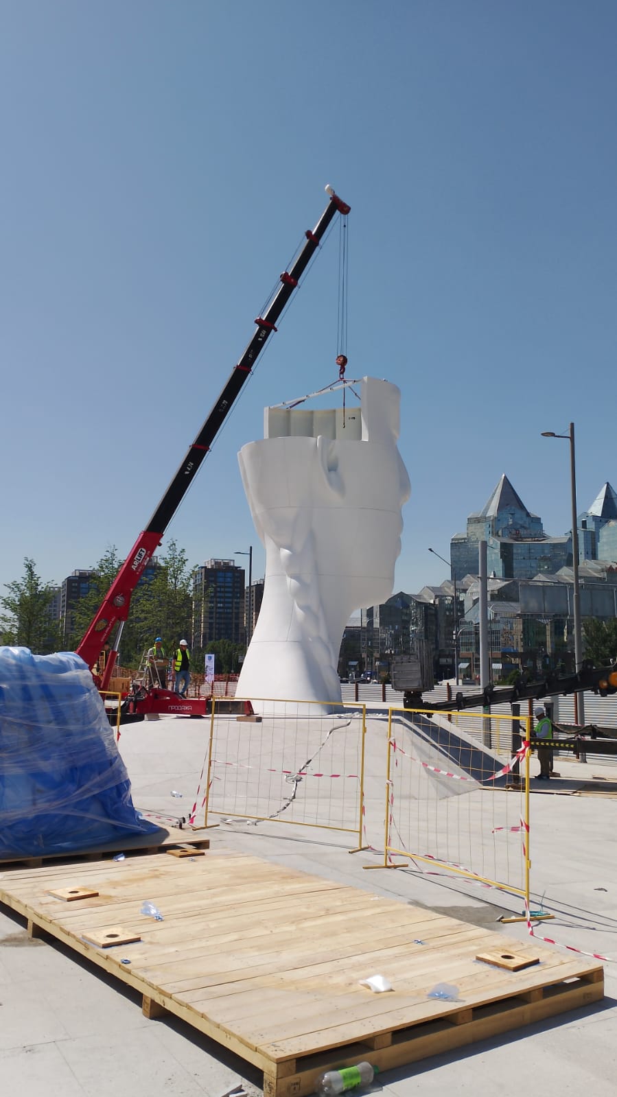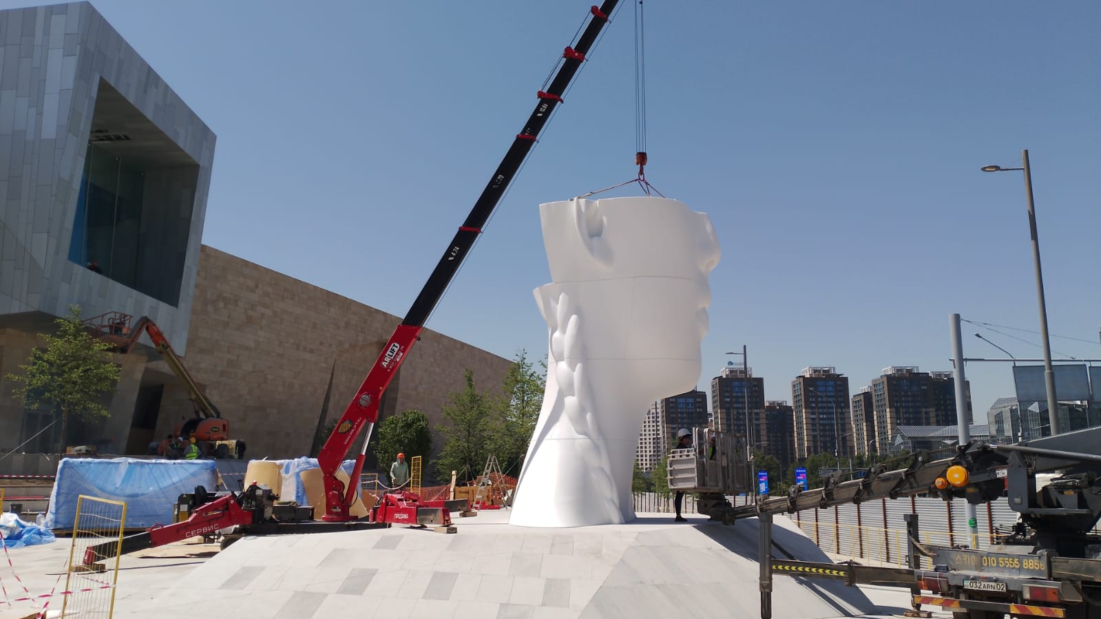 Статую нужно было собрать из деталей как пазл, точно совместив элементы по швам. Справились с помощью мини-крана URW547C2E и ножничных подъёмников LGMG 1012 и LGMG 0808
