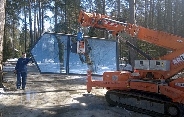 Неизменный тандем мини-крана Jekko SPX 527CDH и вакуумного захвата ARLIFTER GS-750 работал в городе Котельники Московской области на остеклении коттеджа