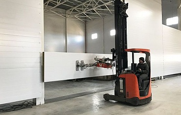 Монтаж панелей вакуумных захватом ARLIFTER SP-4 при строительстве склада в городе Новосибирск