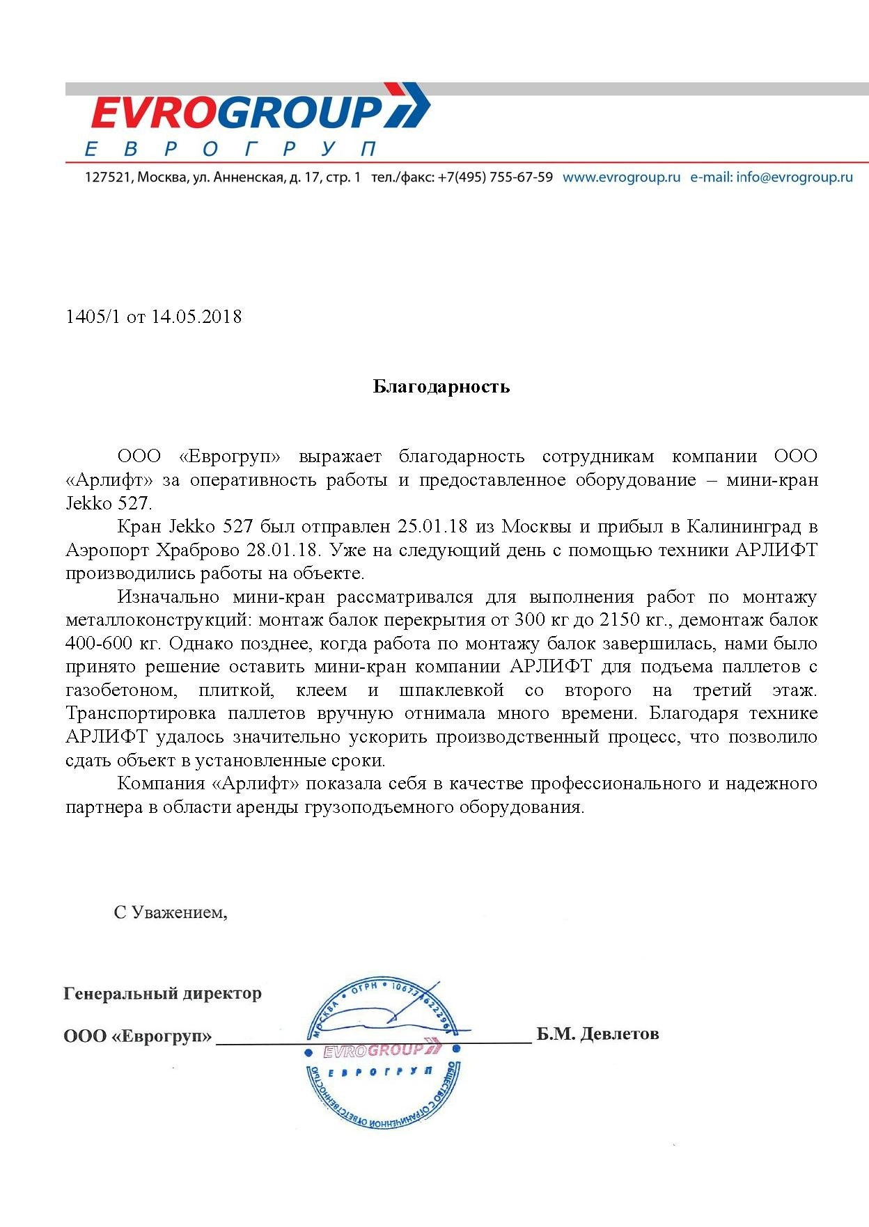 Участие в реконструкции аэропорта «Храброво» отмечено благодарственным письмом.