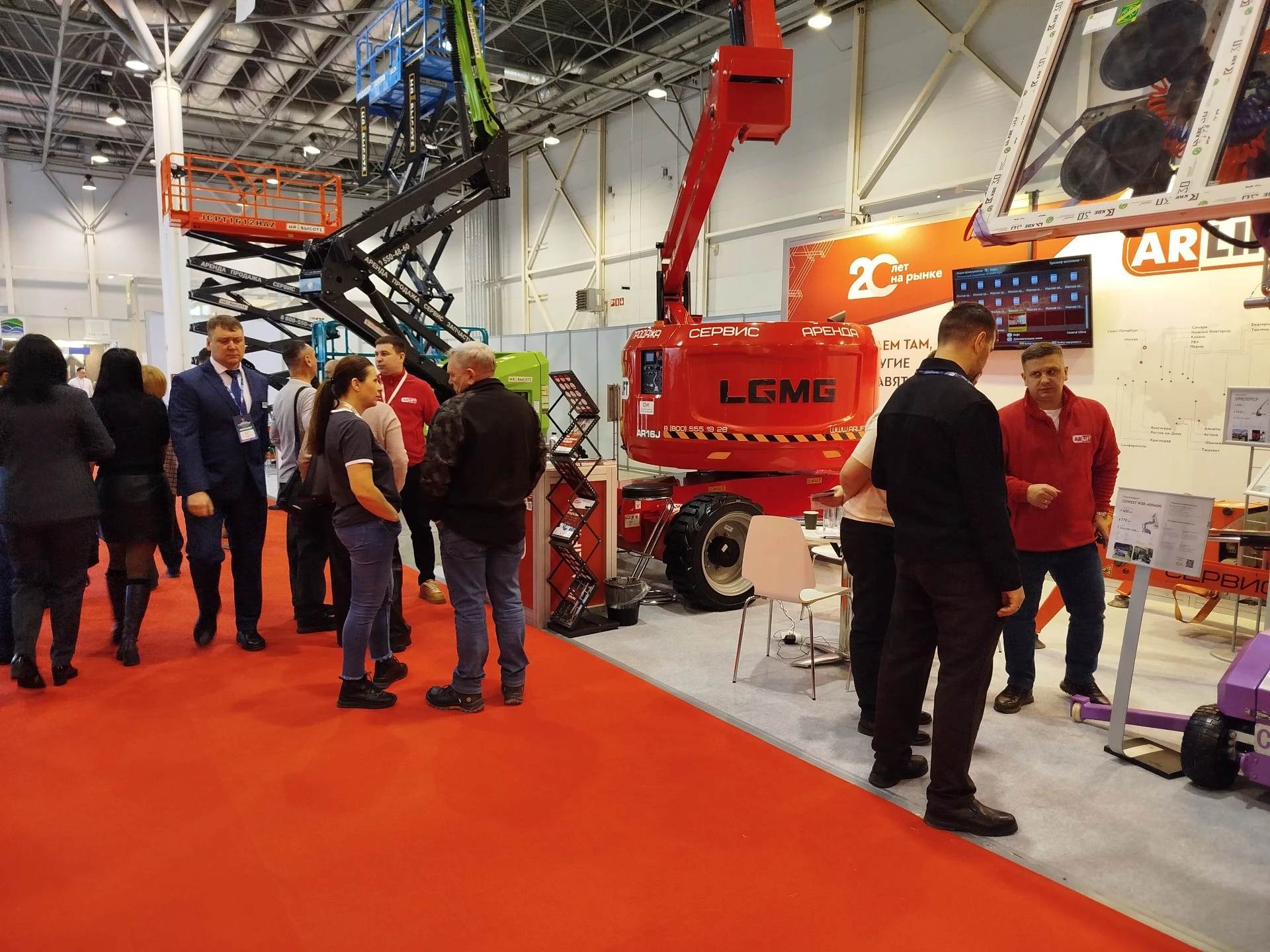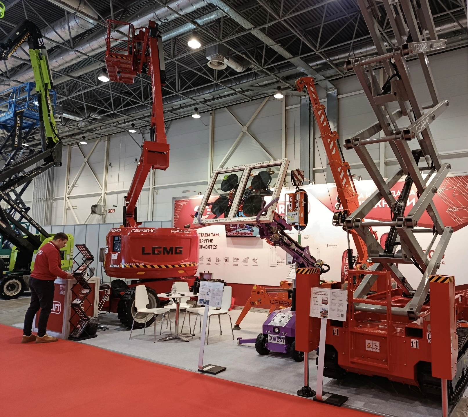 По традиции, на стенде можно было вживую познакомиться с нашей техникой. Мы привезли самый компактный в парке мини-кран SPB209, который проходит через стандартные дверные проёмы и перевозится в обычном грузовом лифте. При этом кран поднимает грузы весом в тонну. Категорию подъёмников представляли ножничный LGMG 1616 и коленчатый LGMG AR16J: применяются для высотных работ — монтажа, обслуживания фасадов, подъёма людей и грузов. Стеклоробот SR-400 Mini — универсальное решение, чтобы перевезти и установить стёкла внутри помещений.